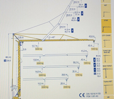 Высота подъёма крана 45 метров. Длина горизонтальной стрелы 60 метров. Грузоподъемность 6 тонны, грузоподъемность на конце стрелы 1,9 тонны.